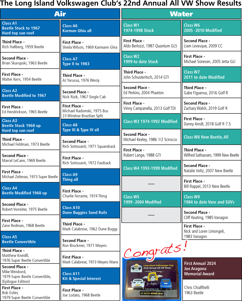 [ Home | Meetings & Events | Application | Message Board | Past Events | Club Store | Contact Us ] The Long Island Volkswagen Club's 22nd Annual All VW Show, Sunday, September 15, 2024 Show Results Back to Show Photos